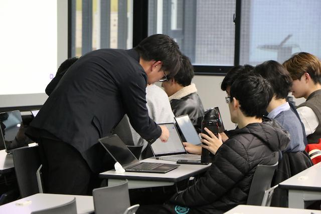汎用AIや特化AIの種類について知り、実際にノーコードAIアプリ開発ツール「Dify」を試します。行政や企業で活用されていることを知り、セットアップの後、自分のキャラクターAIをつくり、実際にAIと話してみました。初めて操作する学生も多く、授業補助者3名も教室を回って支援しました。