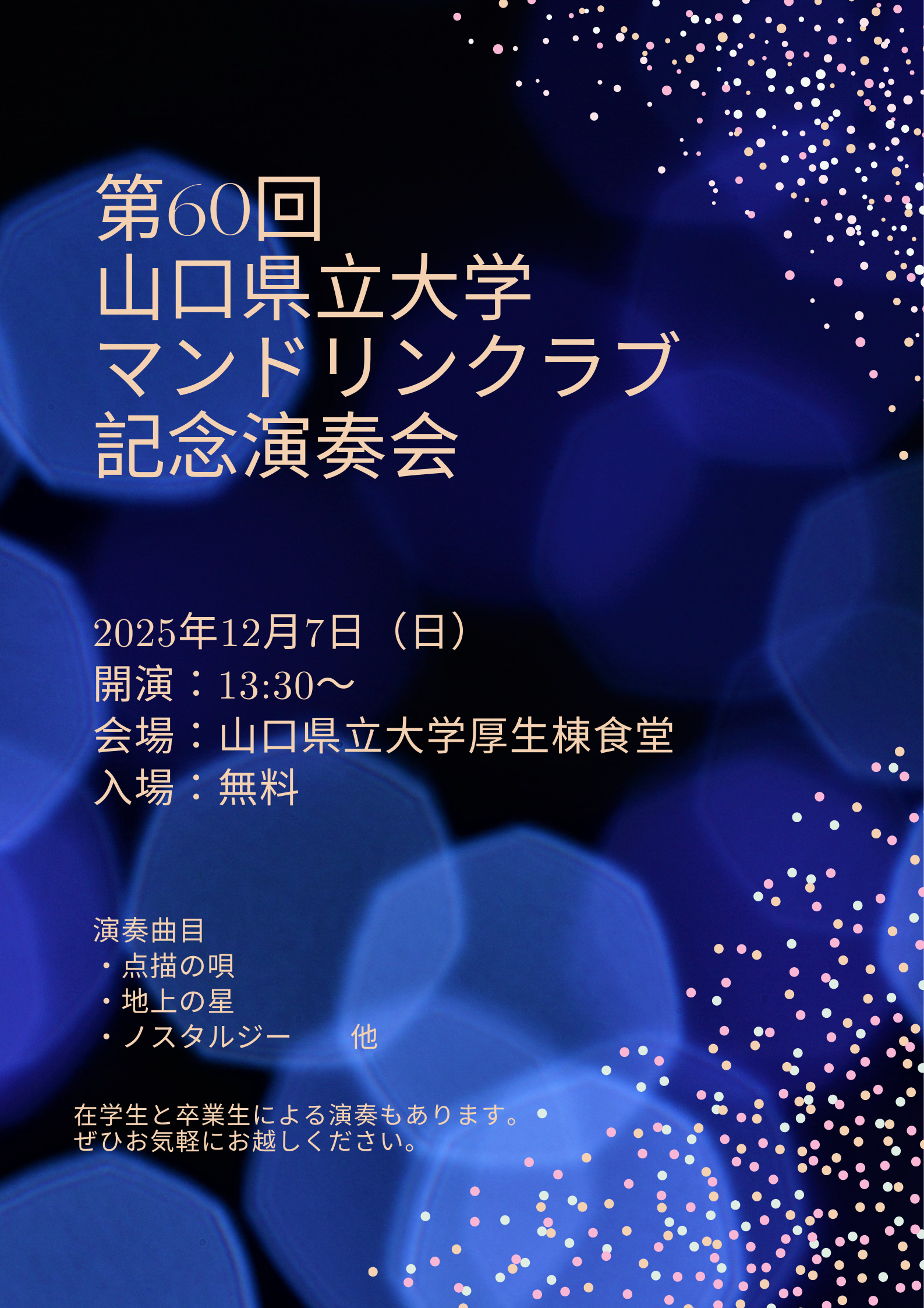 山口県立大学マンドリンクラブでは60回目の記念演奏会を開催します。 在学生と卒業生の合同演奏も見どころです。 マンドリンの素敵な音色を聴いてみませんか?ぜひ、みなさまお気軽にお越しください。 【日時】 2025年12月7日(日) 13:30~開演 【会場】 山口県立大学厚生棟食堂(北キャンパス) 【入場】 無料・申込不要